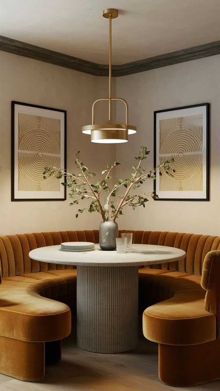 “Modern dining nook with curved mustard velvet banquette seating, round stone pedestal table, gold pendant light, and minimalist framed abstract art.”